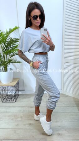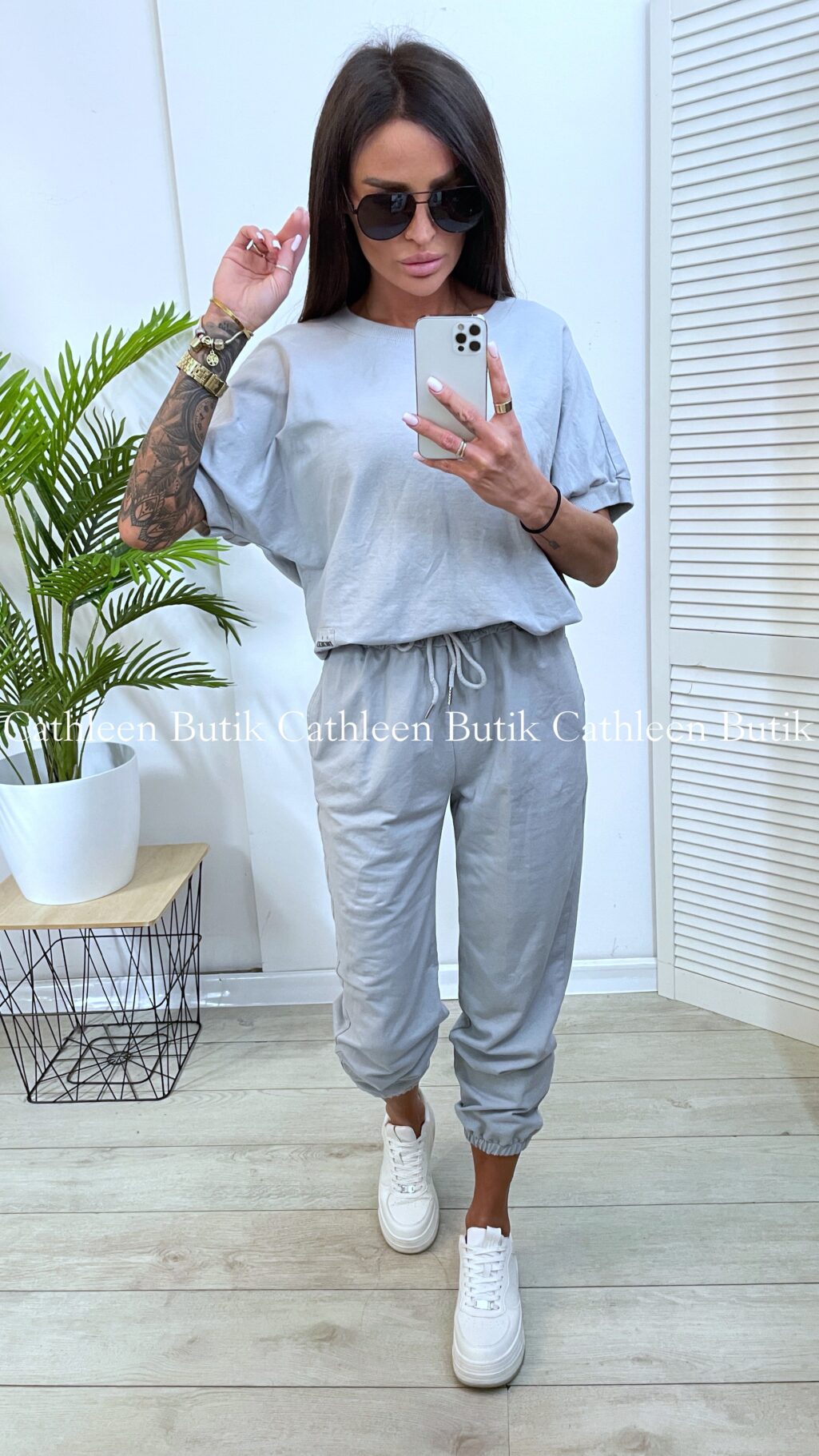 Joggery wykonane z mięsistej bawełny, utrzymane w fasonie oversize. Zapewnią maksimum luzu. Dzięki szerokiej gumce z wiązaniem w pasie sama zdecydujesz jak chcesz je nosić spodnie – wysoko w talii czy nisko na pasie. Bluza na krotki rękaw. W takim secie na pewno nie przejdziesz niezauważona a przy okazji poczujesz co to komfort i wygoda.