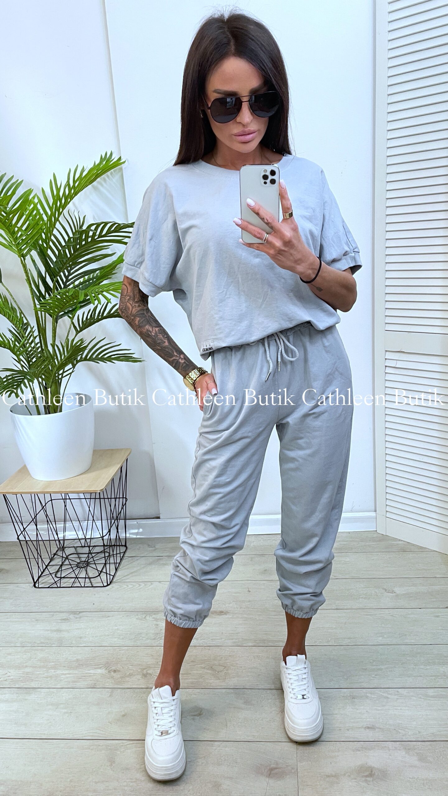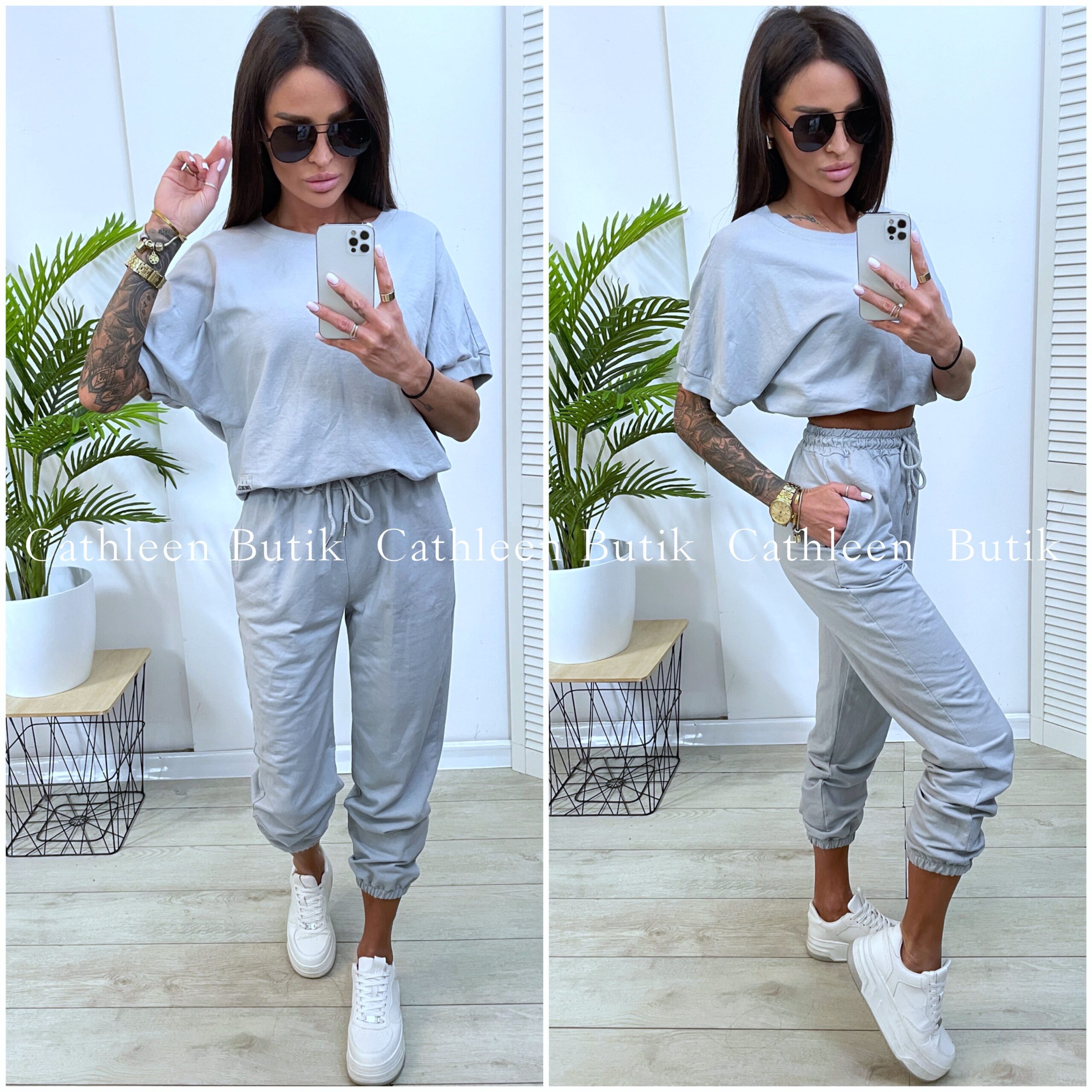Joggery wykonane z mięsistej bawełny, utrzymane w fasonie oversize. Zapewnią maksimum luzu. Dzięki szerokiej gumce z wiązaniem w pasie sama zdecydujesz jak chcesz je nosić spodnie – wysoko w talii czy nisko na pasie. Bluza na krotki rękaw. W takim secie na pewno nie przejdziesz niezauważona a przy okazji poczujesz co to komfort i wygoda.